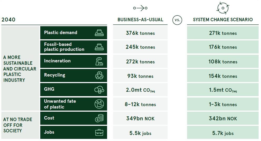 The System Change Scenario offers multiple environmental, economic, and social benefits, including: (a) a more efficient use of resources with a significant reduction of fossil-based virgin plastic; (b) a contribution to the fight against climate change; (c) a reduction in mismanaged plastic waste, reducing the impact on Norwegian ecosystems; and (d) a shift away from waste-to-energy incineration.