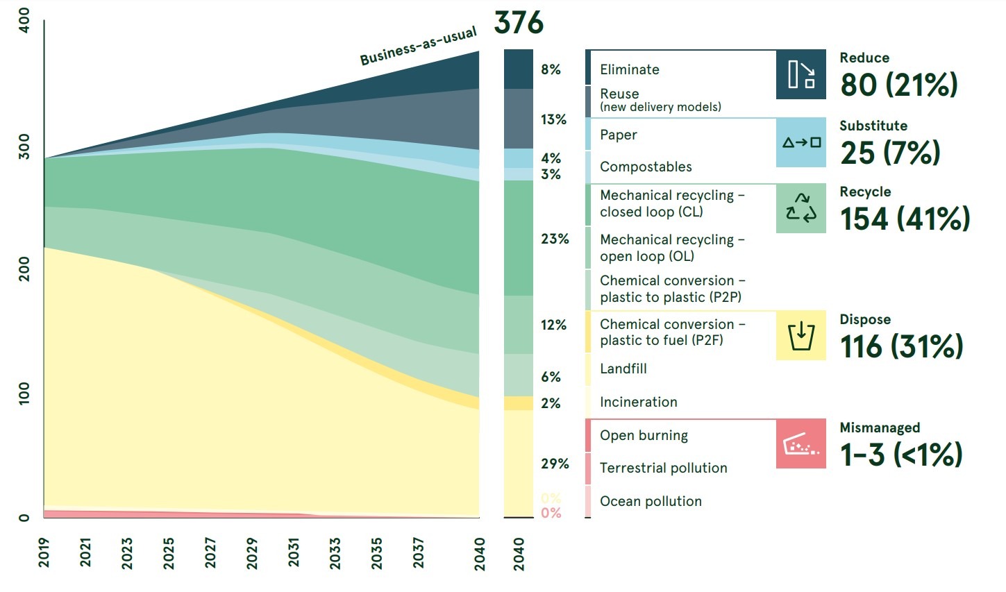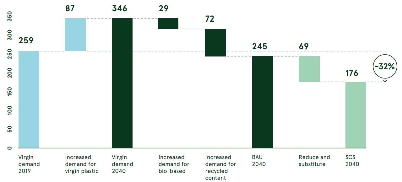 This figure shows virgin plastic demand in 2019, 2040, and in 2040 after the Reduce and Substitute levers are applied.