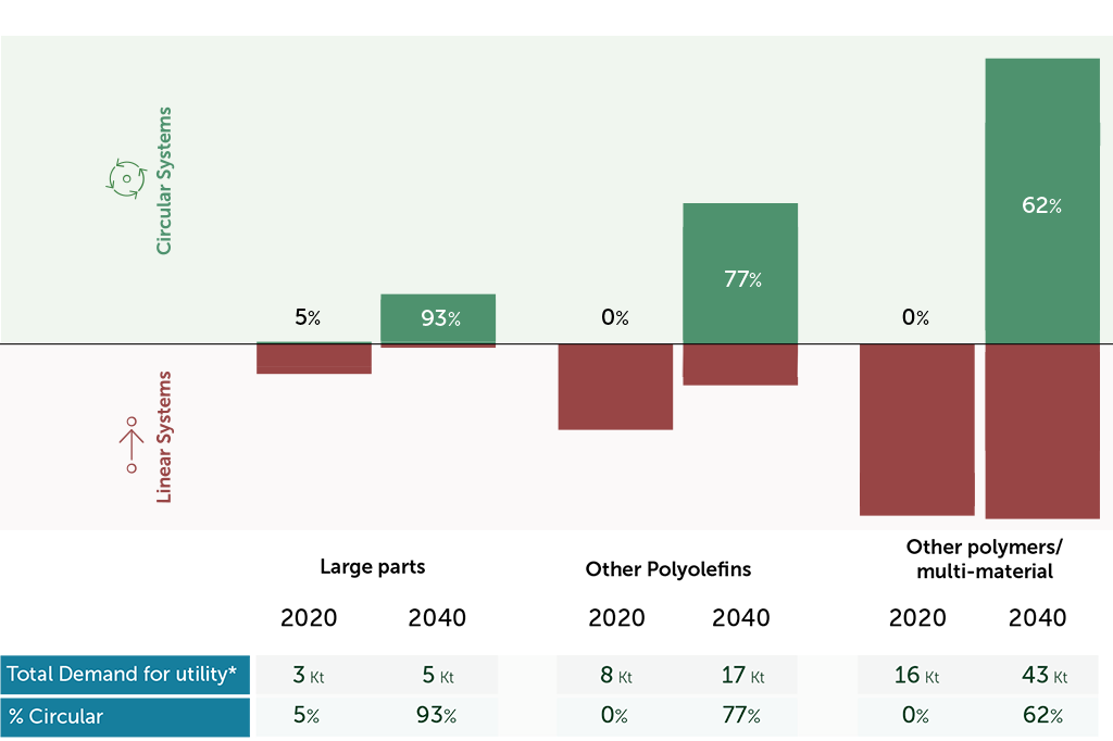 as the properties of polymers in ELVs deteriorate during the use-phase due to UV exposure, wear and tear, etc., resulting in low quality recyclates. In addition, plastic components in vehicles typically have very strict specifications and require virgin quality material, particularly for safety-critical parts and exterior components that affect the aesthetics of the vehicle. Therefore, the potential for closed-loop mechanical recycling is limited. While there is some opportunity to use mechanical recyclate from other sectors, particularly consumable applications, this is also limited in terms of both the quantity and quality of the supply. Given these technical challenges, and the suitability of the shredder light fraction to thermal treatment, we expect chemical recycling to play an increasingly significant – though still complementary – role in this sector. In the System Change Scenario, ~22% of plastic waste, equal to ~13,000 tonnes is chemically recycled and recirculated back into the plastic system by 2040.